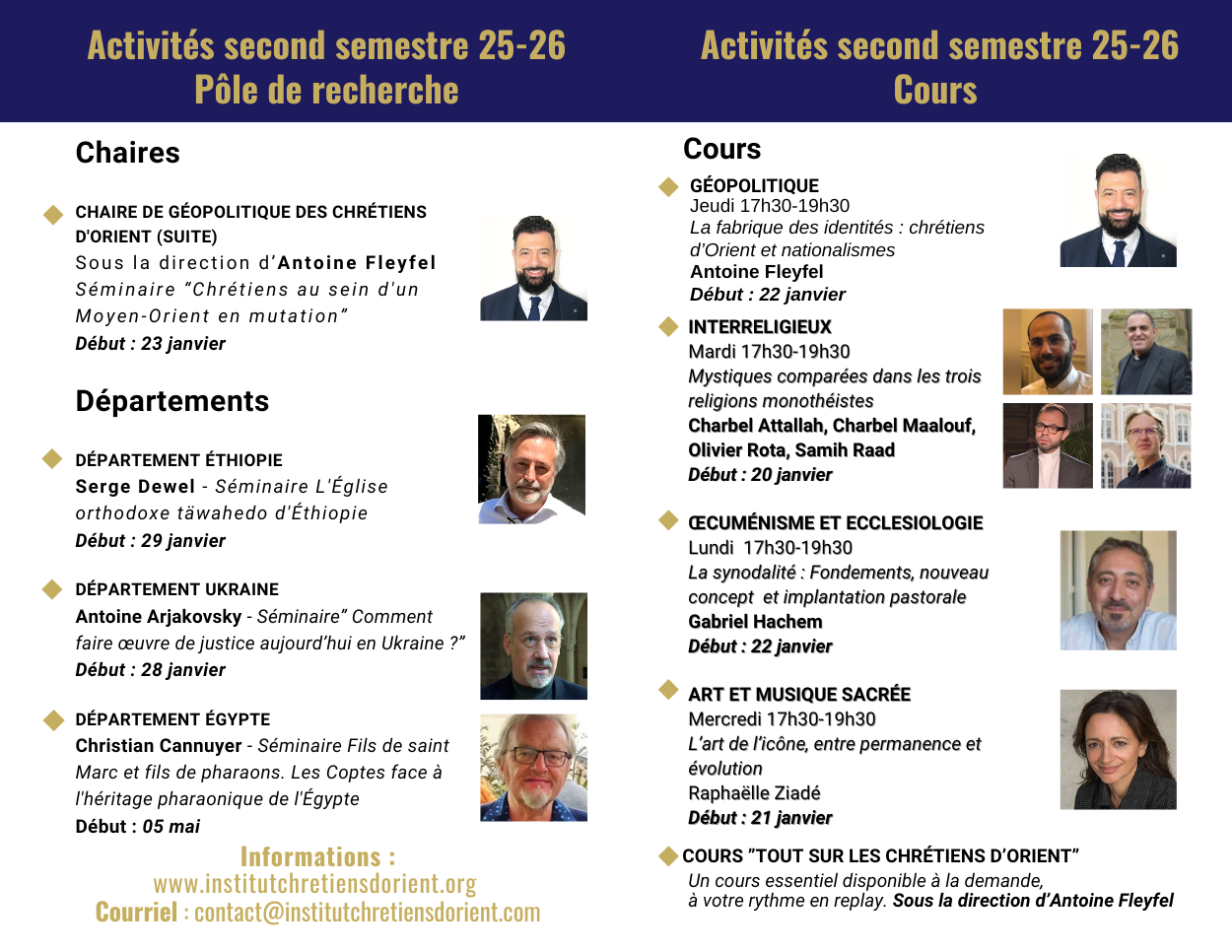 Le second semestre s'ouvre à l'Institut chrétiens d'Orient et propose à nouveau un riche programme en cours et en séminaire ! Il est temps de vous inscrire ! N'hésitez pas à prendre contact pour en savoir plus auprès du secrétariat. Les inscriptions se font directement en ligne. Les cours et séances de séminaires sont également donnés à distance avec replay.