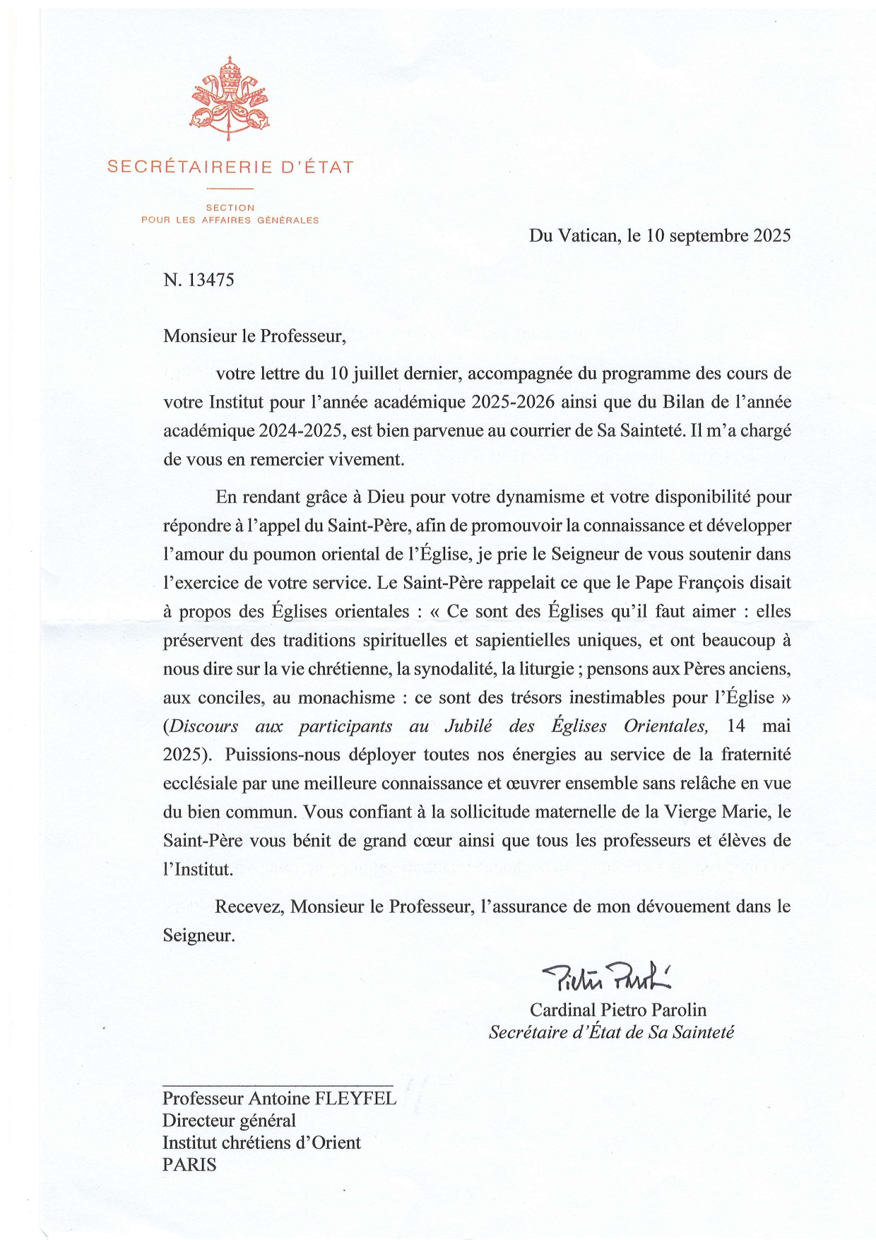 Votre lettre du 10 juillet dernier, accompagnée du programme des cours de votre Institut pour l'année académique 2025-2026 ainsi que du Bilan de I'année académique2024-2025, est bien parvenue au courrier de Sa Sainteté. Il m'a chargé de vous en remercier vivement....