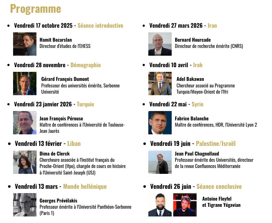 Ce séminaire entend poursuivre l’analyse de ces mutations en cours en suivant la trajectoire de plusieurs pays clés. Est-ce que le Liban va disparaître politiquement ? Quel avenir pour Israël après le 7 octobre 2023 ? La Syrie pourrait-elle se reconstruire ? L’autre objectif consiste à examiner l’impact des changements climatiques et des crises sur les sociétés et la démographie.